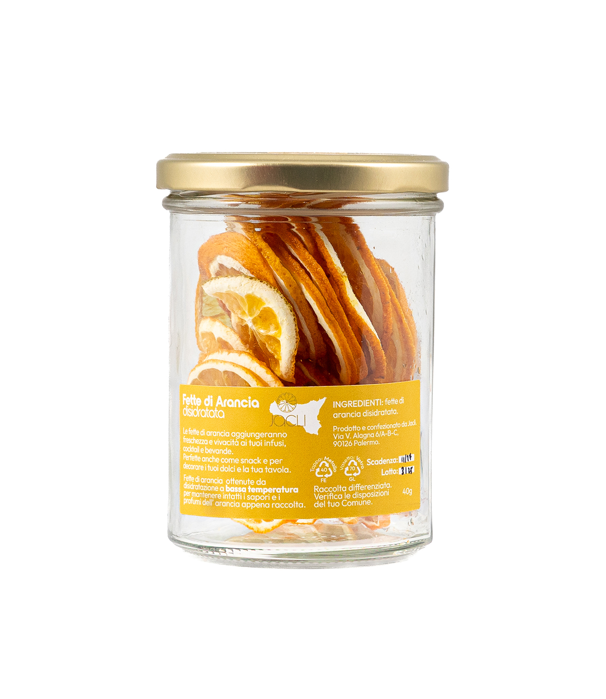 Le Fette di Arance Siciliane Disidratate di Jacli Liquorificio Artigianale sono un prodotto interamente naturale e versatile, ottenuto dagli agrumi non trattati coltivati nell’antico agrumeto della Conca d’Oro di Palermo. Jacli si impegna nel recupero di questi storici agrumeti, coltivando gli agrumi con metodi naturali nel rispetto dei cicli produttivi.