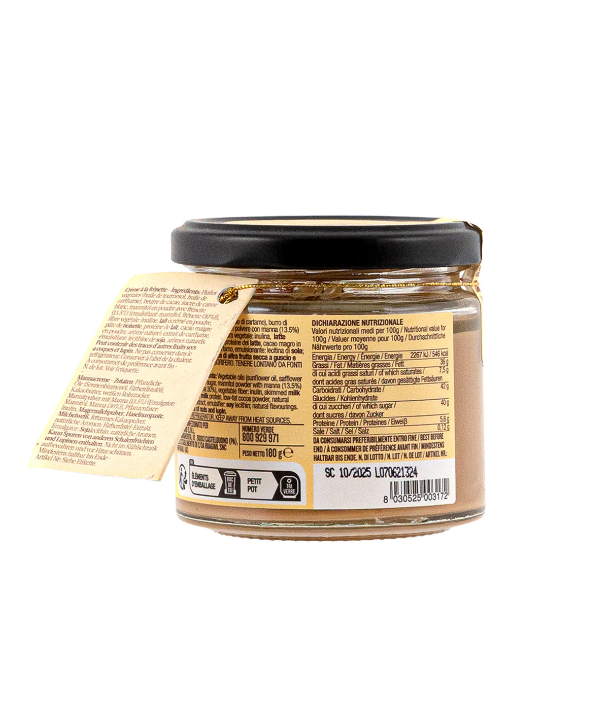 La ricetta esclusiva Fiasconaro valorizza ingredienti di alta qualità come olio di girasole, burro di cacao, nocciole, latte in polvere e manna naturale (13,5%), creando una crema vellutata, aromatica e inconfondibile. Dal profumo elegante e dal gusto delicato, regala un’esperienza di piacere unica e raffinata.