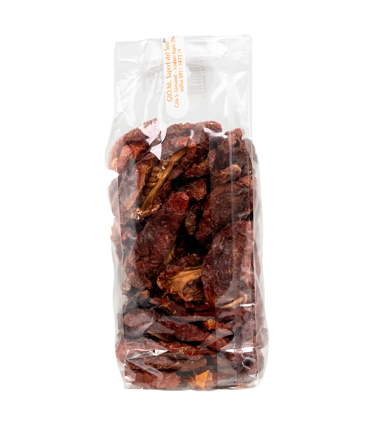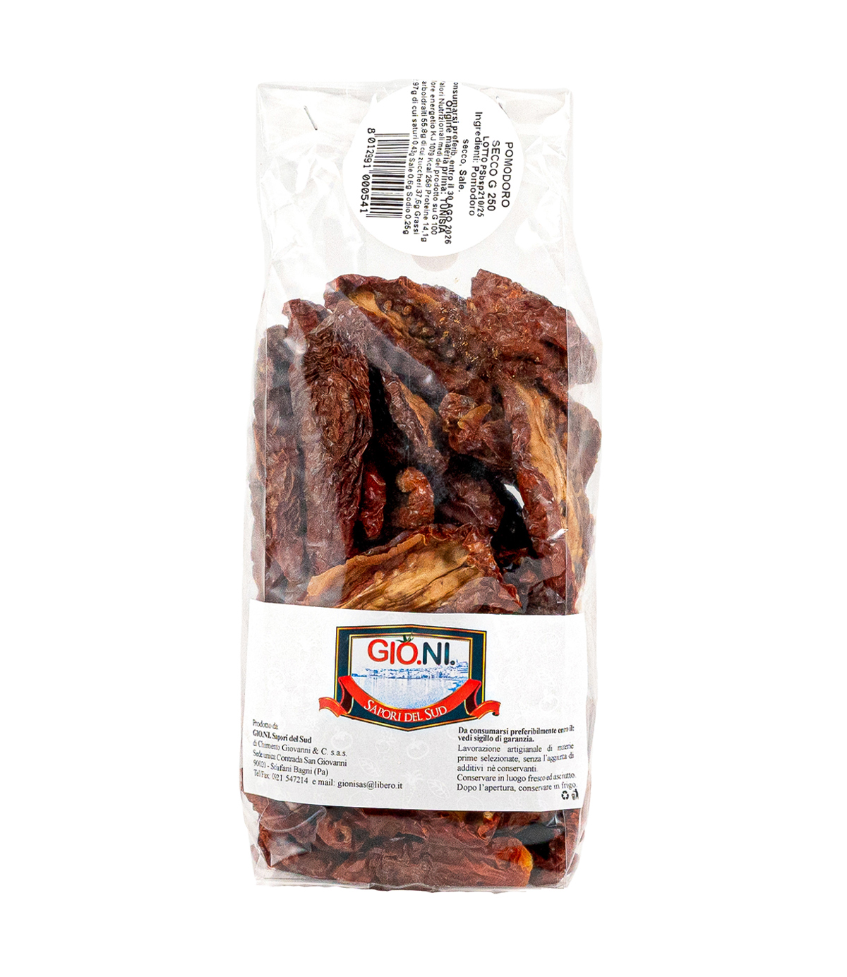 I Pomodori Secchi in Busta sono una specialità artigianale siciliana ottenuta da pomodori locali selezionati, essiccati naturalmente al sole secondo la tradizione contadina. Questo processo lento e naturale permette di concentrare tutto il gusto dolce e sapido del pomodoro fresco, preservandone il profumo e il colore vivace.